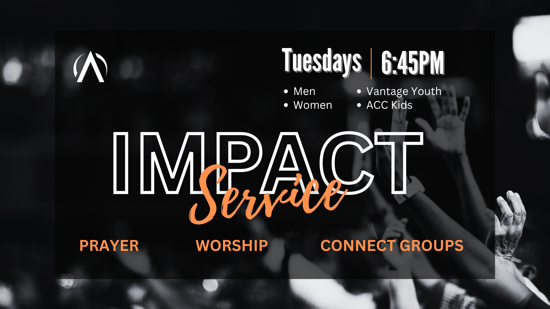 Join us in community on Tuesdays for our Impact Service as we gather first for a time of worship and prayer together and then enjoy time in connect groups for men, women, youth and kids too!