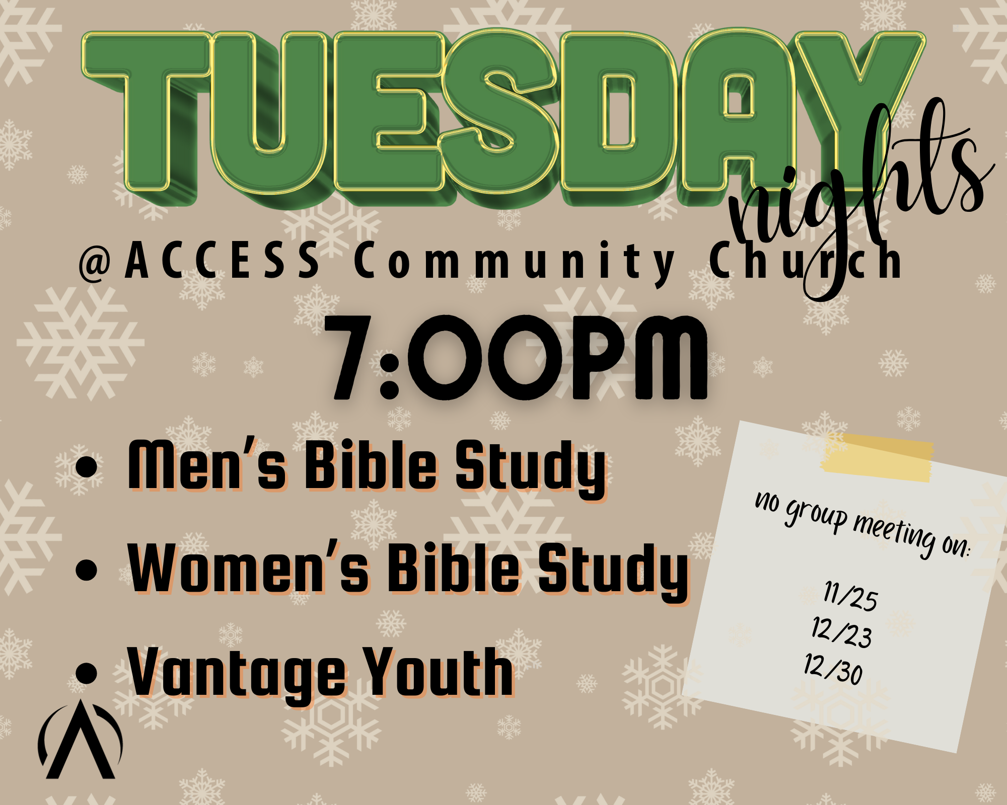 Take a break in the work week on and join us on Tuesdays for a time to connect together in the Word and in building authentic relationships centered on Jesus.