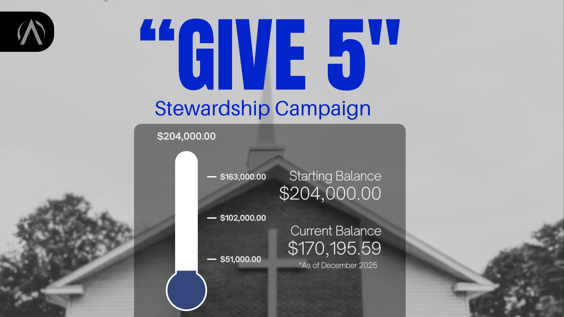 Our GIVE 5 Stewardship Campaign began in the Fall of 2023 and has provided the financial resources needed to make necessary repairs and improvements to our church facilities and grounds that were long overdue. Through much prayer and preparation as His church on mission for Jesus, God has provided the financial resources through a loan agreement within our Assemblies of God financial network to complete several large improvement projects including a new roof, newly paved and expanded parking lot, new carpeting and ministry space improvements offering a more safe and welcoming environment to experience the love of Jesus Christ.